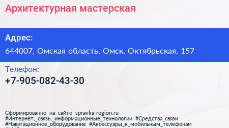 Архитектурная мастерская по адресу 644007, Омская область, Омск, Октябрьская, 157 в дальнейшем Организация, размещена в следующих категориях: