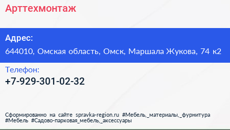 Арттехмонтаж по адресу 644010, Омская область, Омск, Маршала Жукова, 74 к2 в дальнейшем Организация, размещена в следующих категориях: