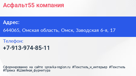 Асфальт55, компания по адресу 644065, Омская область, Омск, Заводская 6-я, 17 в дальнейшем Организация, размещена в следующих категориях: