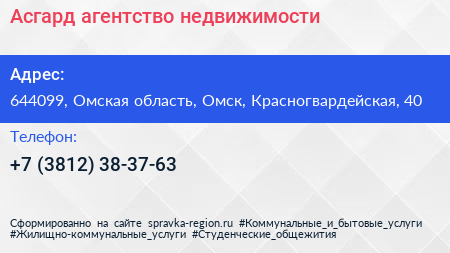 Асгард, агентство недвижимости по адресу 644099, Омская область, Омск, Красногвардейская, 40 в дальнейшем Организация, размещена в следующих категориях: