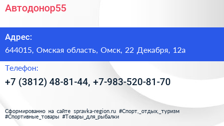 Автодонор55 по адресу 644015, Омская область, Омск, 22 Декабря, 12а в дальнейшем Организация, размещена в следующих категориях: