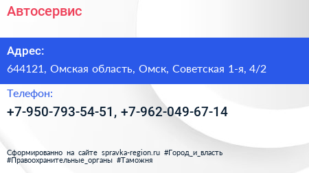Автосервис по адресу 644121, Омская область, Омск, Советская 1-я, 4/2 в дальнейшем Организация, размещена в следующих категориях: