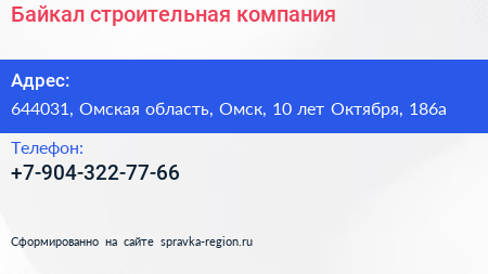 Байкал, строительная компания по адресу 644031, Омская область, Омск, 10 лет Октября, 186а в дальнейшем Организация, размещена в следующих категориях: