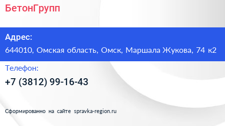 БетонГрупп по адресу 644010, Омская область, Омск, Маршала Жукова, 74 к2 в дальнейшем Организация, размещена в следующих категориях: