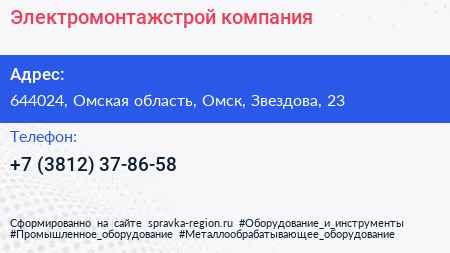 Электромонтажстрой, компания по адресу 644024, Омская область, Омск, Звездова, 23 в дальнейшем Организация, размещена в следующих категориях: