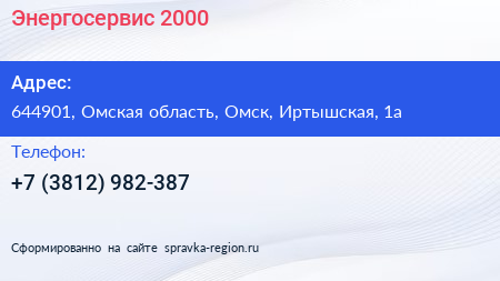 Энергосервис 2000 по адресу 644901, Омская область, Омск, Иртышская, 1а в дальнейшем Организация, размещена в следующих категориях: