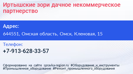 Иртышские зори, дачное некоммерческое партнерство по адресу 644551, Омская область, Омск, Кленовая, 15 в дальнейшем Организация, размещена в следующих категориях: