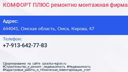 КОМФОРТ ПЛЮС, ремонтно-монтажная фирма по адресу 644041, Омская область, Омск, Кирова, 47 в дальнейшем Организация, размещена в следующих категориях: