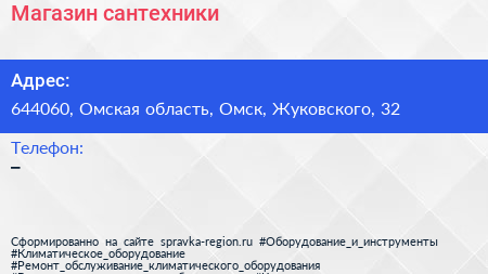 Магазин сантехники по адресу 644060, Омская область, Омск, Жуковского, 32 в дальнейшем Организация, размещена в следующих категориях: