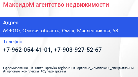 МаксидоМ, агентство недвижимости по адресу 644010, Омская область, Омск, Масленникова, 58 в дальнейшем Организация, размещена в следующих категориях: