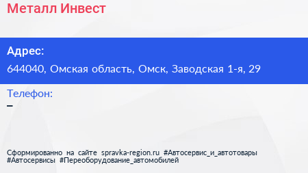 Металл Инвест по адресу 644040, Омская область, Омск, Заводская 1-я, 29 в дальнейшем Организация, размещена в следующих категориях: