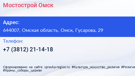 Мостострой-Омск по адресу 644007, Омская область, Омск, Гусарова, 29 в дальнейшем Организация, размещена в следующих категориях: