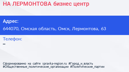 НА ЛЕРМОНТОВА, бизнес-центр по адресу 644070, Омская область, Омск, Лермонтова, 63 в дальнейшем Организация, размещена в следующих категориях: