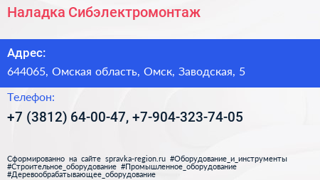 Наладка Сибэлектромонтаж по адресу 644065, Омская область, Омск, Заводская, 5 в дальнейшем Организация, размещена в следующих категориях: