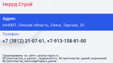 Неруд Строй по адресу 644007, Омская область, Омск, Тарская, 25 в дальнейшем Организация, размещена в следующих категориях: