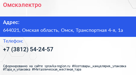 Омскэлектро по адресу 644021, Омская область, Омск, Транспортная 4-я, 1а в дальнейшем Организация, размещена в следующих категориях: