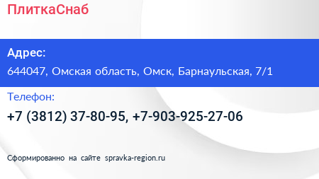 ПлиткаСнаб по адресу 644047, Омская область, Омск, Барнаульская, 7/1 в дальнейшем Организация, размещена в следующих категориях: