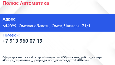 Полюс Автоматика по адресу 644099, Омская область, Омск, Чапаева, 71/1 в дальнейшем Организация, размещена в следующих категориях: