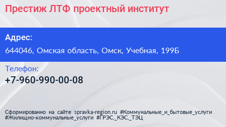 Престиж-ЛТФ, проектный институт по адресу 644046, Омская область, Омск, Учебная, 199Б в дальнейшем Организация, размещена в следующих категориях: