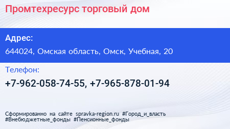 Промтехресурс, торговый дом по адресу 644024, Омская область, Омск, Учебная, 20 в дальнейшем Организация, размещена в следующих категориях: