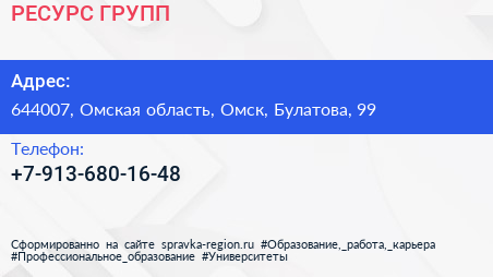 РЕСУРС ГРУПП по адресу 644007, Омская область, Омск, Булатова, 99 в дальнейшем Организация, размещена в следующих категориях: