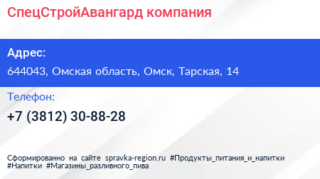 СпецСтройАвангард, компания по адресу 644043, Омская область, Омск, Тарская, 14 в дальнейшем Организация, размещена в следующих категориях: