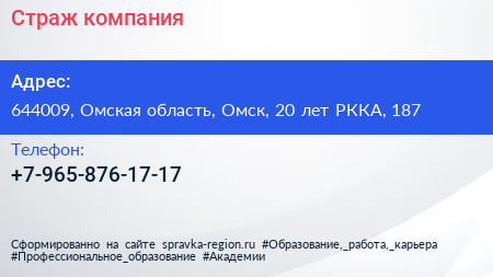 Страж, компания по адресу 644009, Омская область, Омск, 20 лет РККА, 187 в дальнейшем Организация, размещена в следующих категориях:
