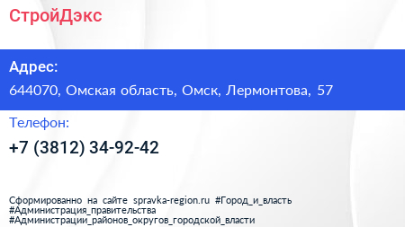 СтройДэкс по адресу 644070, Омская область, Омск, Лермонтова, 57 в дальнейшем Организация, размещена в следующих категориях: