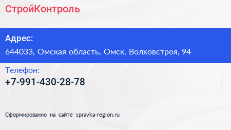 СтройКонтроль по адресу 644033, Омская область, Омск, Волховстроя, 94 в дальнейшем Организация, размещена в следующих категориях: