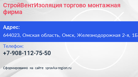 СтройВентИзоляция, торгово-монтажная фирма по адресу 644023, Омская область, Омск, Железнодорожная 2-я, 1Б в дальнейшем Организация, размещена в следующих категориях: