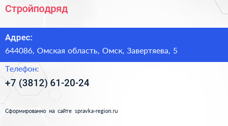 Стройподряд по адресу 644086, Омская область, Омск, Завертяева, 5 в дальнейшем Организация, размещена в следующих категориях: