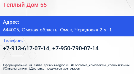Теплый Дом 55 по адресу 644005, Омская область, Омск, Чередовая 2-я, 1 в дальнейшем Организация, размещена в следующих категориях:
