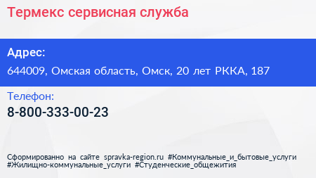 Термекс, сервисная служба по адресу 644009, Омская область, Омск, 20 лет РККА, 187 в дальнейшем Организация, размещена в следующих категориях: