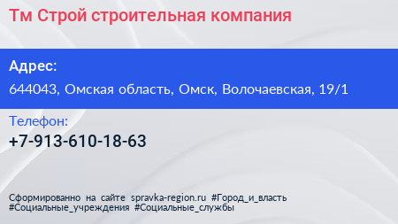Тм-Строй, строительная компания по адресу 644043, Омская область, Омск, Волочаевская, 19/1 в дальнейшем Организация, размещена в следующих категориях: