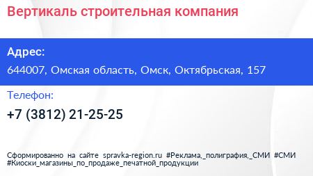 Вертикаль, строительная компания по адресу 644007, Омская область, Омск, Октябрьская, 157 в дальнейшем Организация, размещена в следующих категориях: