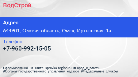 ВодСтрой по адресу 644901, Омская область, Омск, Иртышская, 1а в дальнейшем Организация, размещена в следующих категориях: