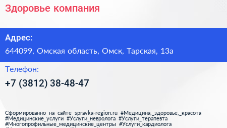 Здоровье, компания по адресу 644099, Омская область, Омск, Тарская, 13а в дальнейшем Организация, размещена в следующих категориях: