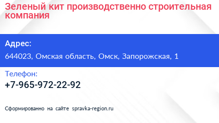 Зеленый кит, производственно-строительная компания по адресу 644023, Омская область, Омск, Запорожская, 1 в дальнейшем Организация, размещена в следующих категориях: