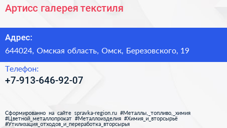 Артисс, галерея текстиля по адресу 644024, Омская область, Омск, Березовского, 19 в дальнейшем Организация, размещена в следующих категориях: