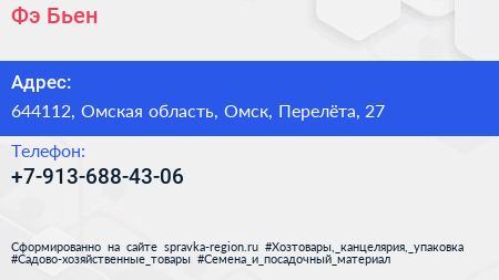 Фэ Бьен по адресу 644112, Омская область, Омск, Перелёта, 27 в дальнейшем Организация, размещена в следующих категориях: