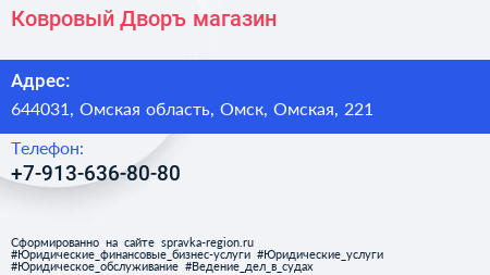 Ковровый Дворъ, магазин по адресу 644031, Омская область, Омск, Омская, 221 в дальнейшем Организация, размещена в следующих категориях: