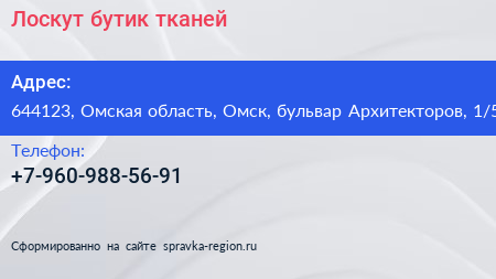 Лоскут, бутик тканей по адресу 644123, Омская область, Омск, бульвар Архитекторов, 1/5 в дальнейшем Организация, размещена в следующих категориях: