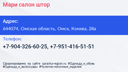 Мари, салон штор по адресу 644074, Омская область, Омск, Конева, 28а в дальнейшем Организация, размещена в следующих категориях: