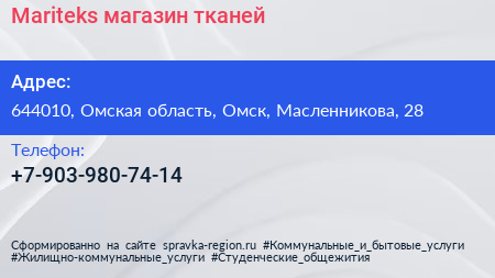 Mariteks, магазин тканей по адресу 644010, Омская область, Омск, Масленникова, 28 в дальнейшем Организация, размещена в следующих категориях: