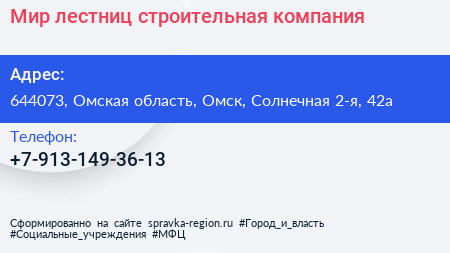 Мир лестниц, строительная компания по адресу 644073, Омская область, Омск, Солнечная 2-я, 42а в дальнейшем Организация, размещена в следующих категориях: