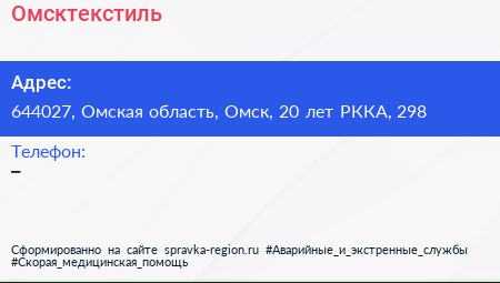 Омсктекстиль по адресу 644027, Омская область, Омск, 20 лет РККА, 298 в дальнейшем Организация, размещена в следующих категориях: