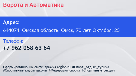 Ворота и Автоматика по адресу 644074, Омская область, Омск, 70 лет Октября, 25 в дальнейшем Организация, размещена в следующих категориях: