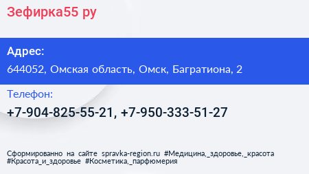 Зефирка55.ру по адресу 644052, Омская область, Омск, Багратиона, 2 в дальнейшем Организация, размещена в следующих категориях: