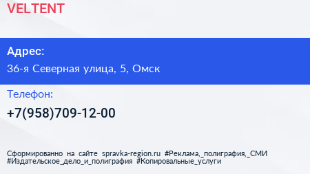 VELTENT по адресу 36-я Северная улица, 5, Омск в дальнейшем Организация, размещена в следующих категориях: