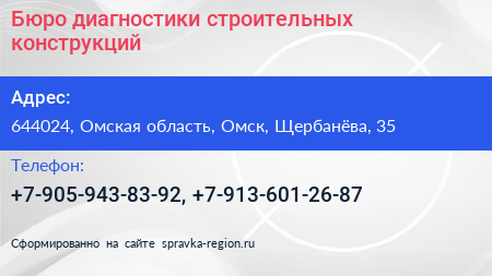 Бюро диагностики строительных конструкций по адресу 644024, Омская область, Омск, Щербанёва, 35 в дальнейшем Организация, размещена в следующих категориях: